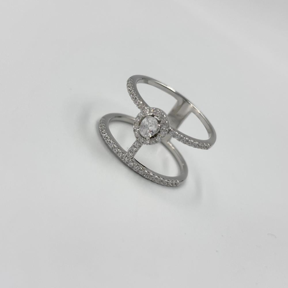 خاتم فضة بتصميم عصري وجريء، يتميز بإطار مزدوج متصل بقطعة مركزية مرصعة بفص زركون لامع. يمنحك هذا التصميم الفريد لمسة أنيقة تناسب جميع الإطلالات والمناسبات