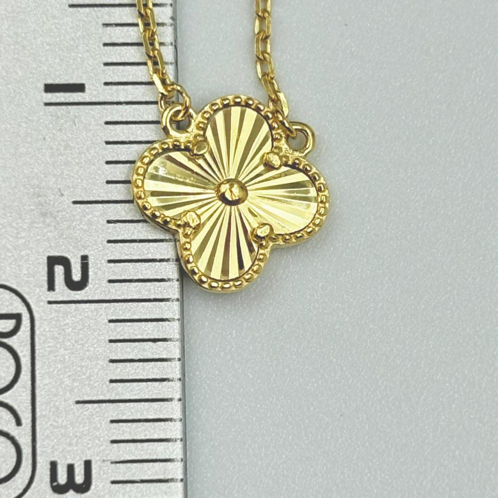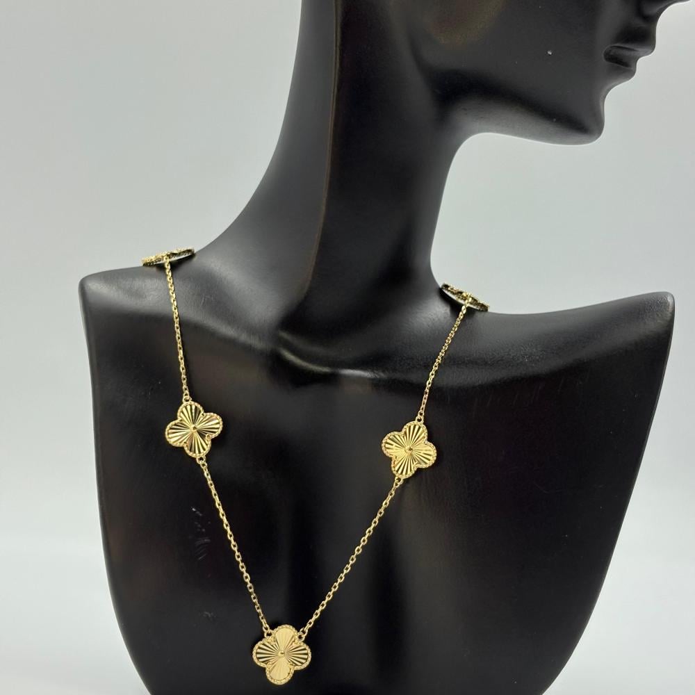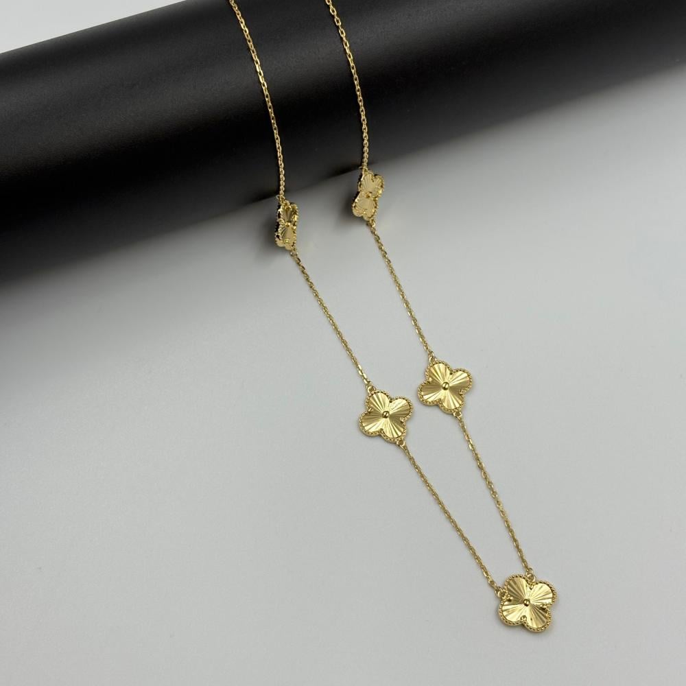 أضيفي لمسة من الفخامة الكلاسيكية لإطلالتك مع هذا العقد الأنيق المصنوع من الفضة والمطلي بلون ذهبي فاخر بتصميم مستوحى من أسلوب Van Cleef ، تفاصيله الناعمة وخفته تجعله مثالي لكل يوم، ويمكن تنسيقه بسهولة مع قطعك المفضلة سواء لإطلالة صباحية ناعمة أو لوك مسائي أنيق.