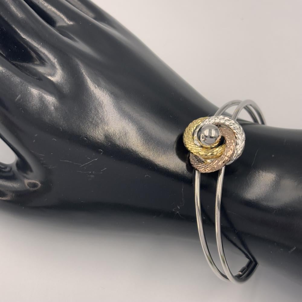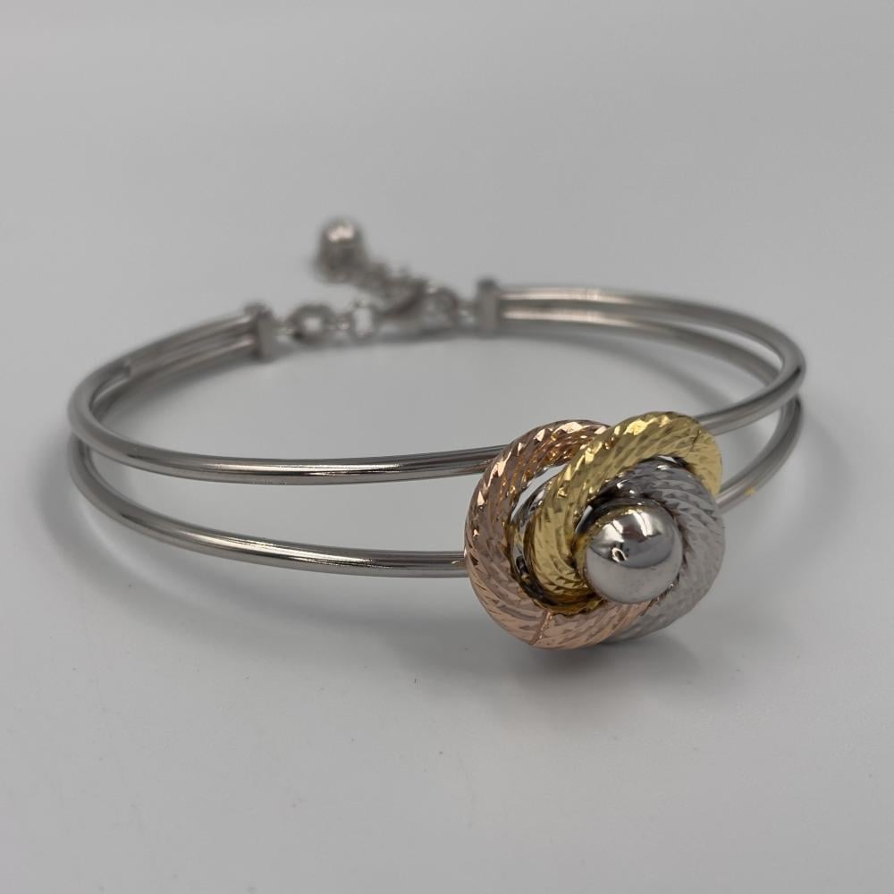 تميزي بلون وتألقي بثلاثة ، سوار فضة كلاسيكي بتصميم مزدوج يعانق المعصم بأناقة ، تتوسطه عقدة ثلاثية من اللون الذهبي الروزقولد والفضي تضيف لمسة من التناغم والجاذبية ، مثالية للمناسبات الخاصة والسهرات.