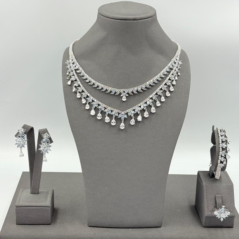 تميّزي بإطلالة راقية مع هذا الطقم الفاخر المصنوع من الفضة اللامعة والمزين بتفاصيل تخطف الأنظار بتصميم مستوحى من الفخامة الكلاسيكية. يجمع بين اللون السماوي الناعم والفضي الكلاسيكي في تناغم أنيق يليق بذوقك المميز. مثالي للمناسبات الخاصة أو كهدية فخمة لمن تحبين.