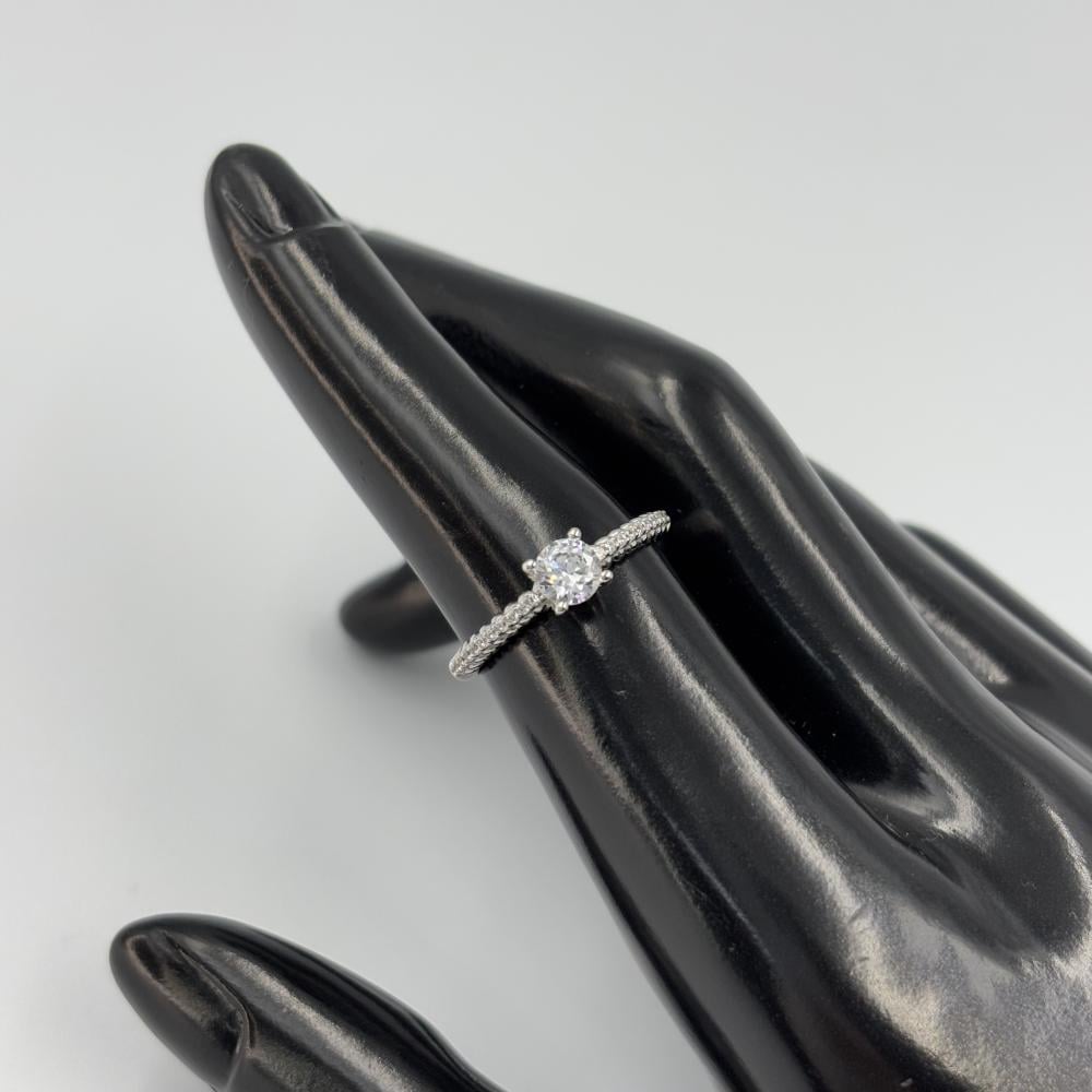 خاتم فضة بتصميم أنيق وراقي. يتميز الخاتم بحجر زركون لامع في المنتصف مع ترصيع دقيق للأحجار الصغيرة على الأطراف، مما يمنحه لمسة فاخرة تناسب جميع المناسبات