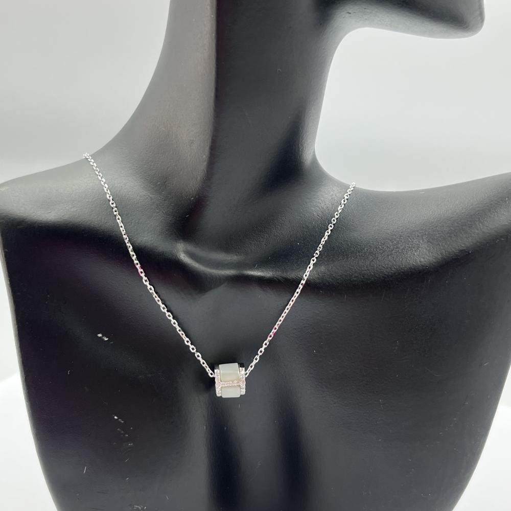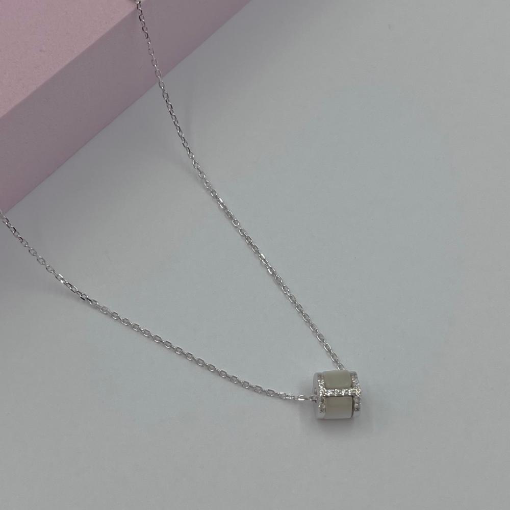 عقد فضة بشكل أسطواني مزين بصدف وفصوص لامعة، يعكس تصميمه الأنيق والجذاب لمسة من الفخامة والأنوثة. هذا العقد الفريد يضيف لمسة ساحرة لإطلالتك، مما يجعله خيارًا مثاليًا للمناسبات الخاصة أو اليومية.