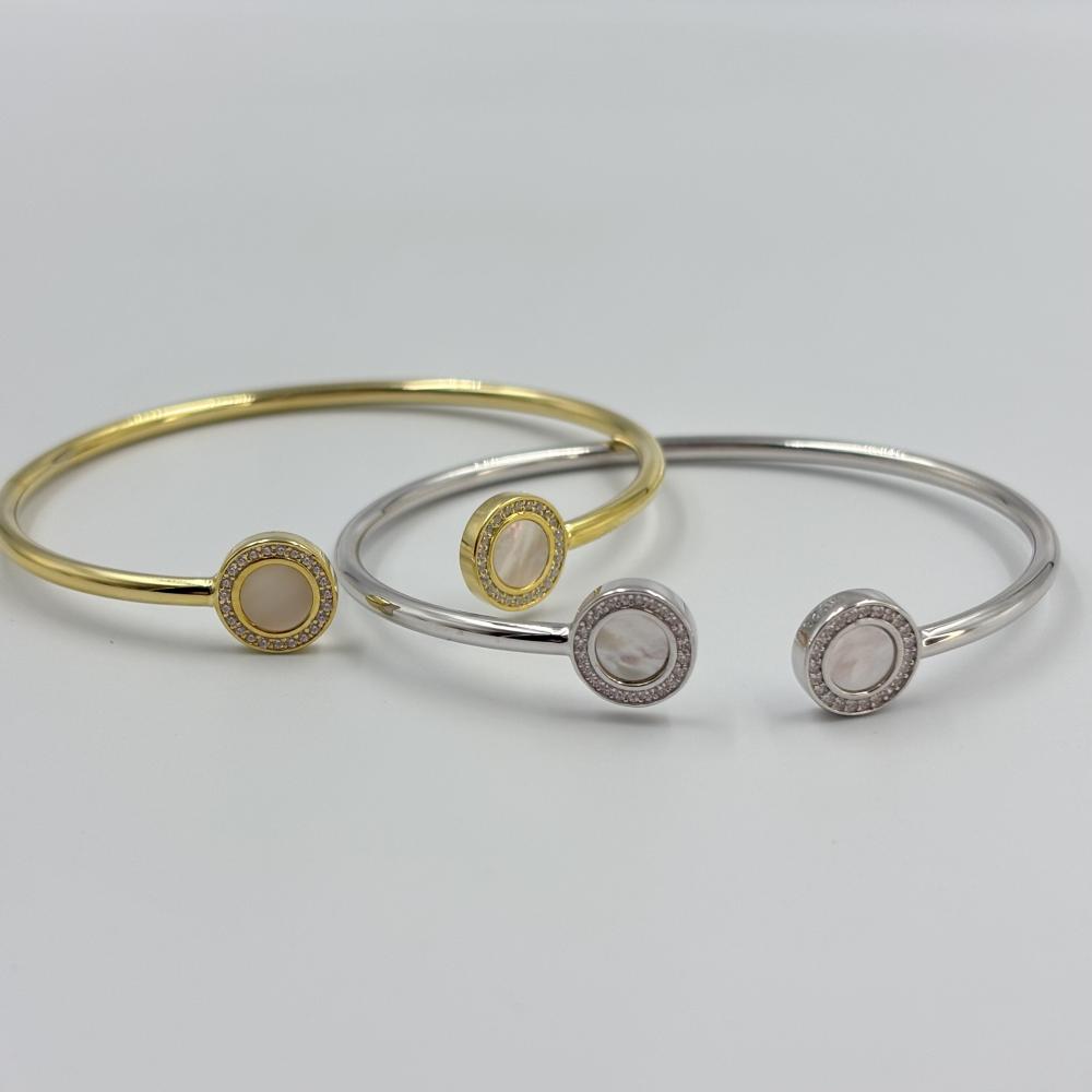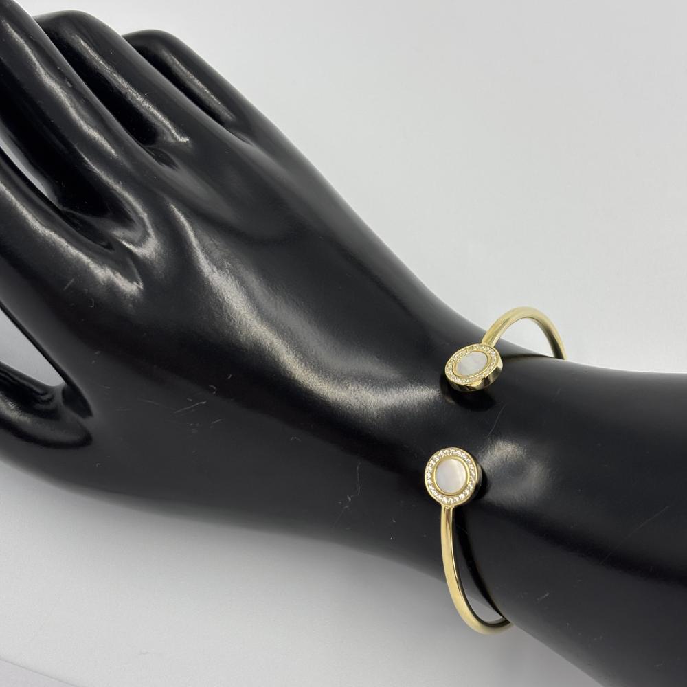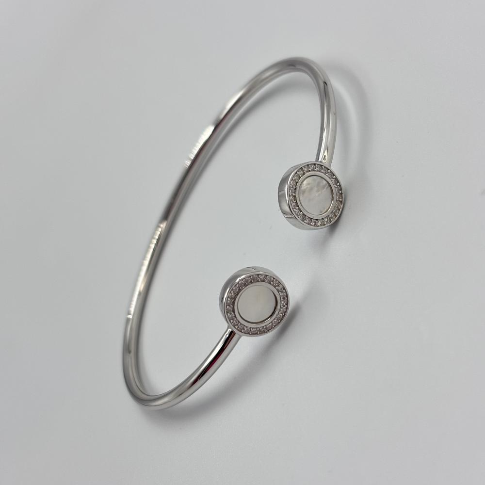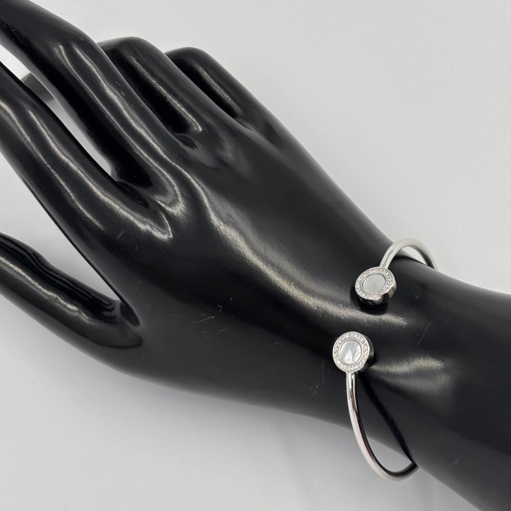 سوار فضة بتصميم مستوحى من بولغري بتصميم عصري وأنيق، مزين بلون أبيض نقي يضفي لمسة من الفخامة والرقي. تصميمه العصري والمميز يجعله قطعة مثالية لإضافة أناقة خاصة إلى إطلالتك.