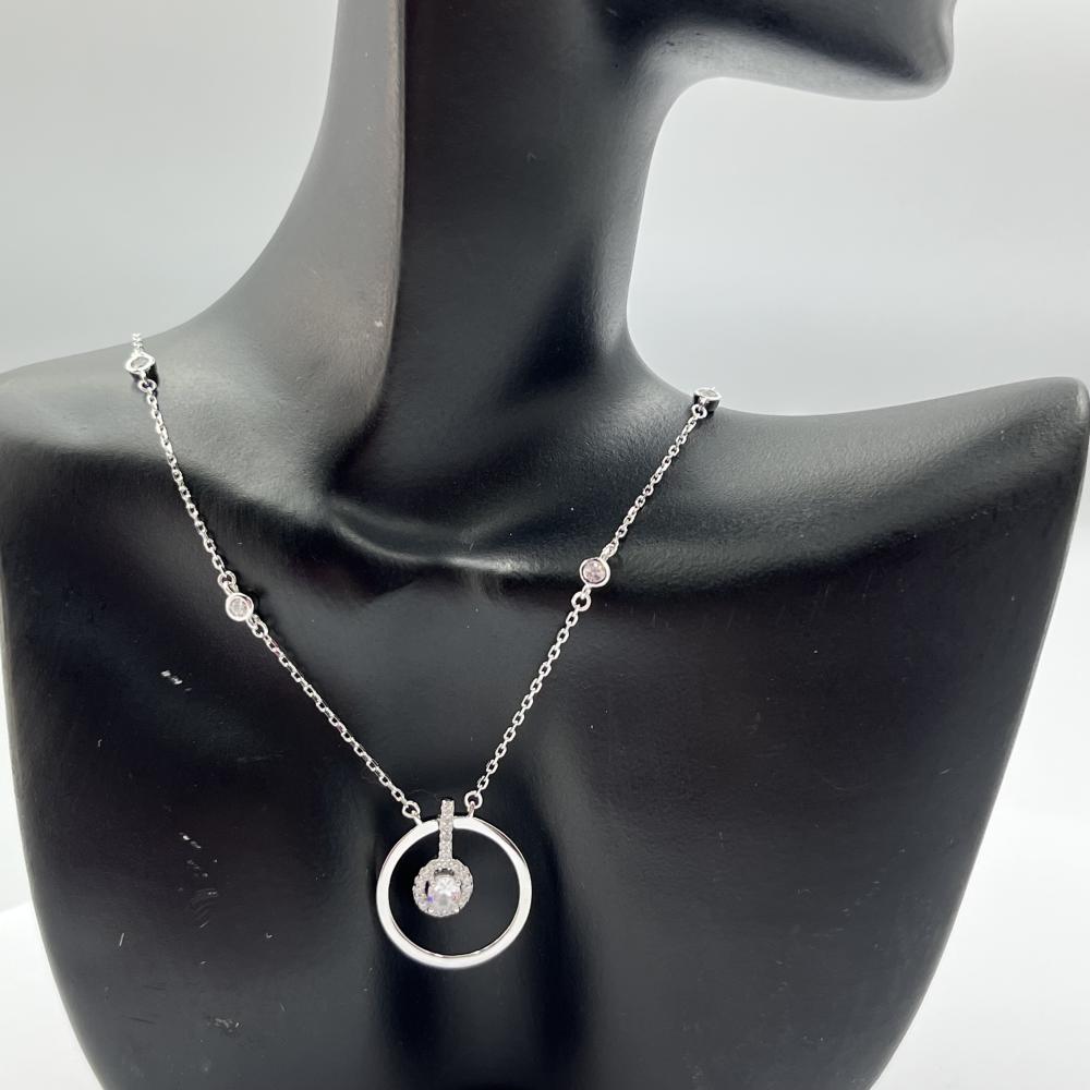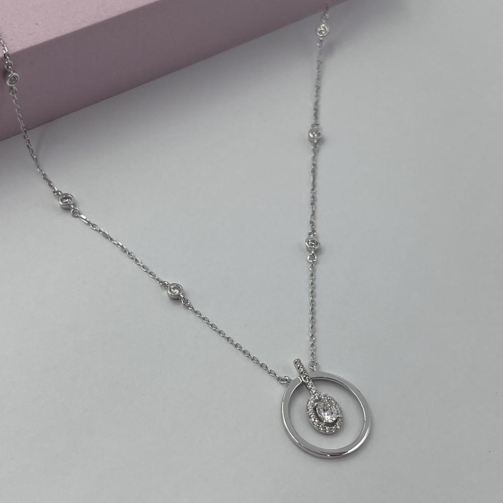 عقد فضة بتصميم مميز، حيث تحتوي السلسلة على فصوص لامعة متوزعة بشكل أنيق، مع شكل دائرة في المنتصف تحتوي على تعليقة متدلية وحجر سوليتير. هذا التصميم الفاخر يضفي لمسة من التألق على إطلالتك ويمنحك مظهرًا ساحرًا يناسب كافة المناسبات.