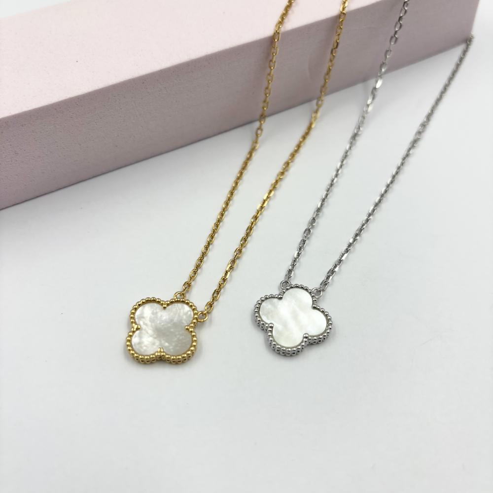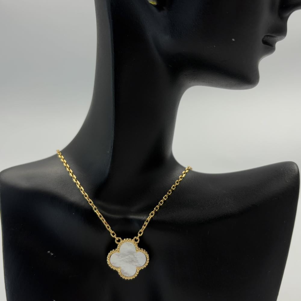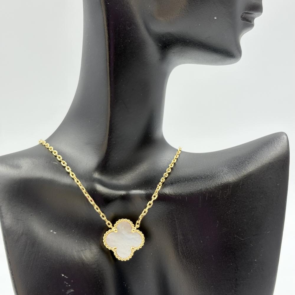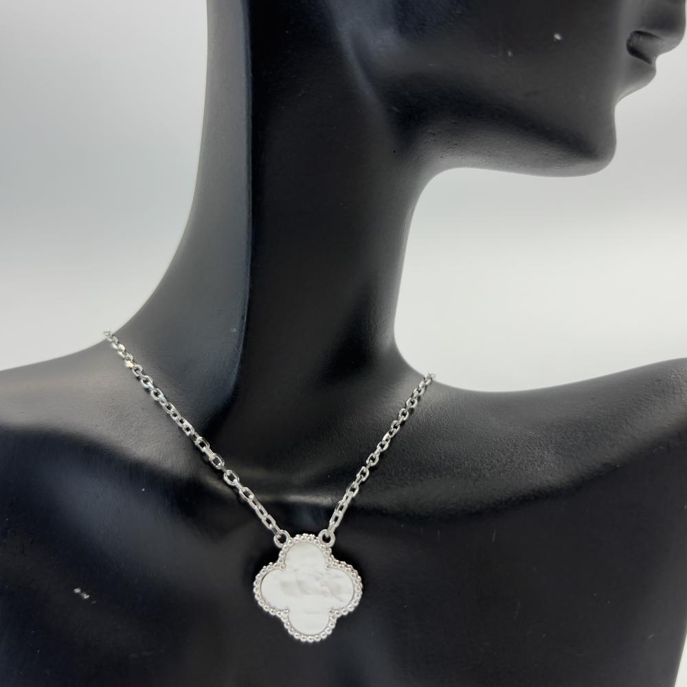 عقد فضة مستوحى من تصميم فان كليف بالصدف الأبيض هو قطعة فاخرة ذات تصميم بسيط وأنيق في آن واحد. يتألق الصدف الأبيض في هذا العقد ليمنحكِ مظهراً ناعماً ومشرقاً، يُعتبر هذا العقد خياراً رائعاً للمناسبات الخاصة أو للإطلالات اليومية التي تتطلب لمسة من الأناقة والتميز.