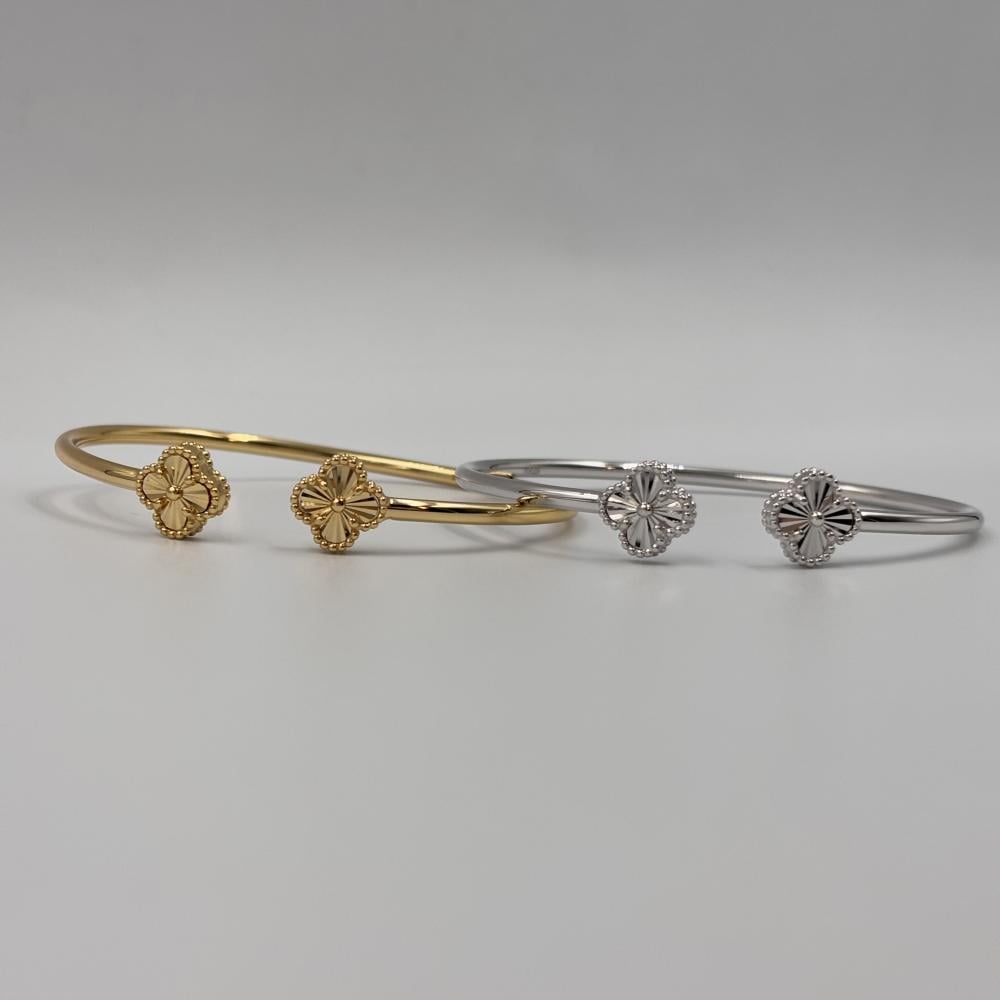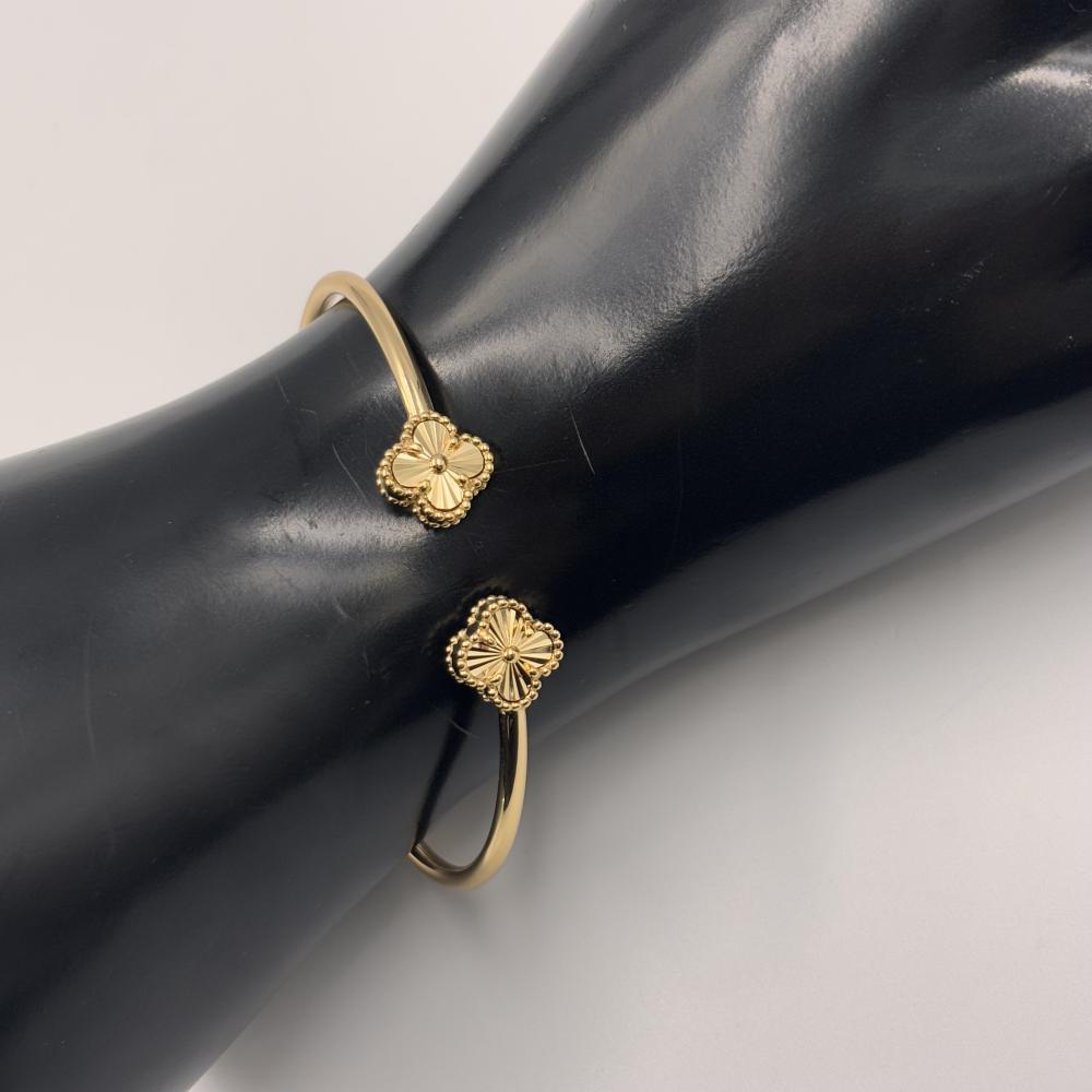 سوار أنيق مصنوع من الفضة بتصميم مفتوح من المنتصف تتزيّن بورود فان كليف الكلاسيكية التي تضيف لمسة من الرقي والأنوثة. تصميم عصري مستوحى من أناقة فان كليف ، يلتف حول المعصم بسلاسة ويمنحك إطلالة ناعمة تلفت الأنظار.
